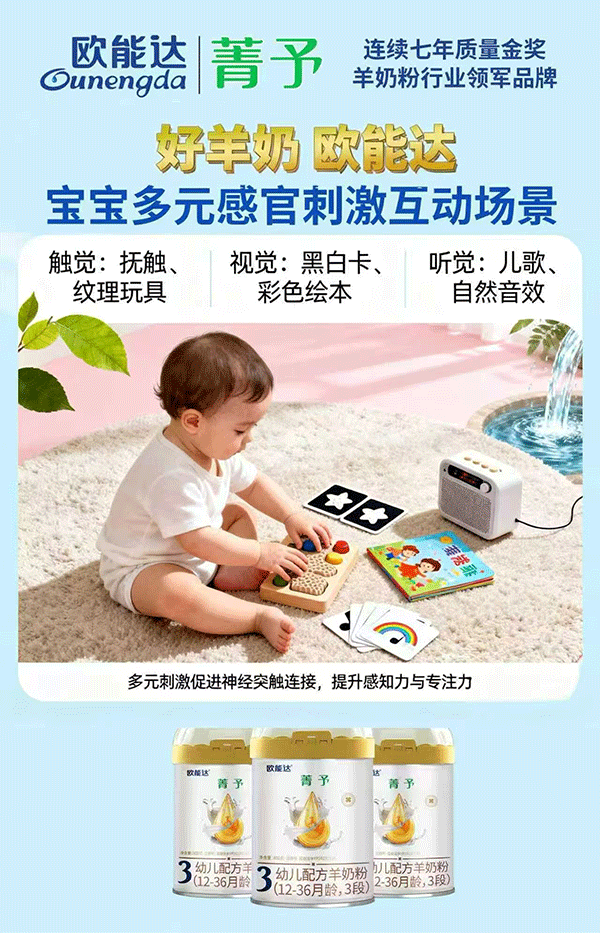 通过抚触、纹理玩具激活触觉,黑白卡、彩色绘本唤醒视觉,儿歌、自然音效丰富听觉,多元刺激促进神经突触连接,让宝宝感知力、专注力同步提升~#欧能达科学育儿